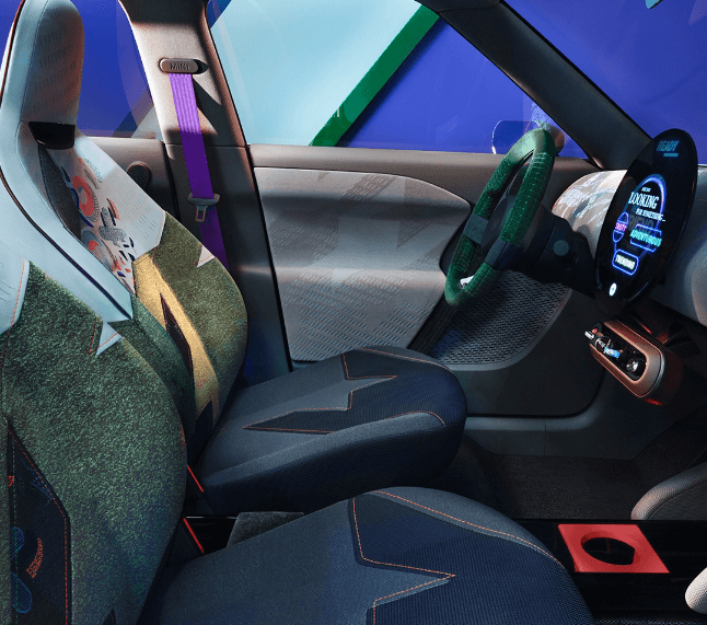 Reduced to the essentials, the leather-free interior of the MINI Concept Aceman combines classic MINI cues with sustainable materials like recycled plastics. The panoramic roof sheds plenty of light on the fine colour nuances and soft-touch surfaces, incorporated to create a highly emotive driving experience.